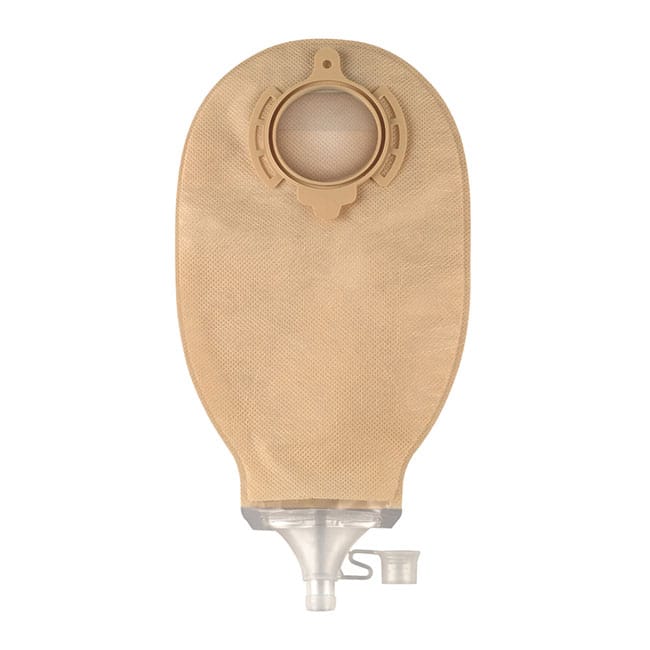 Poche de stomie vidable avec bouchon pour couplage mécanique avec anneau flottant et guide de pose.